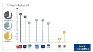 Produktene i TreStjerner-serien er tilpasset ulike underlag og bruksområder. Lurer du på hvilket produkt du bør velge? Alt avhenger av hvilket utseende du ønsker, og hvilke krav du har til vedlikehold og slitasje. I denne tabellen kan du se slitestyrken til de ulike produktene, og finne den varianten som passer dine behov. TreStjerner Slitestyrkeindex er grundig utviklet gjennom mange år med testing. Normal slitasje tilsvarer bruk av en familie på fire med kjæledyr.